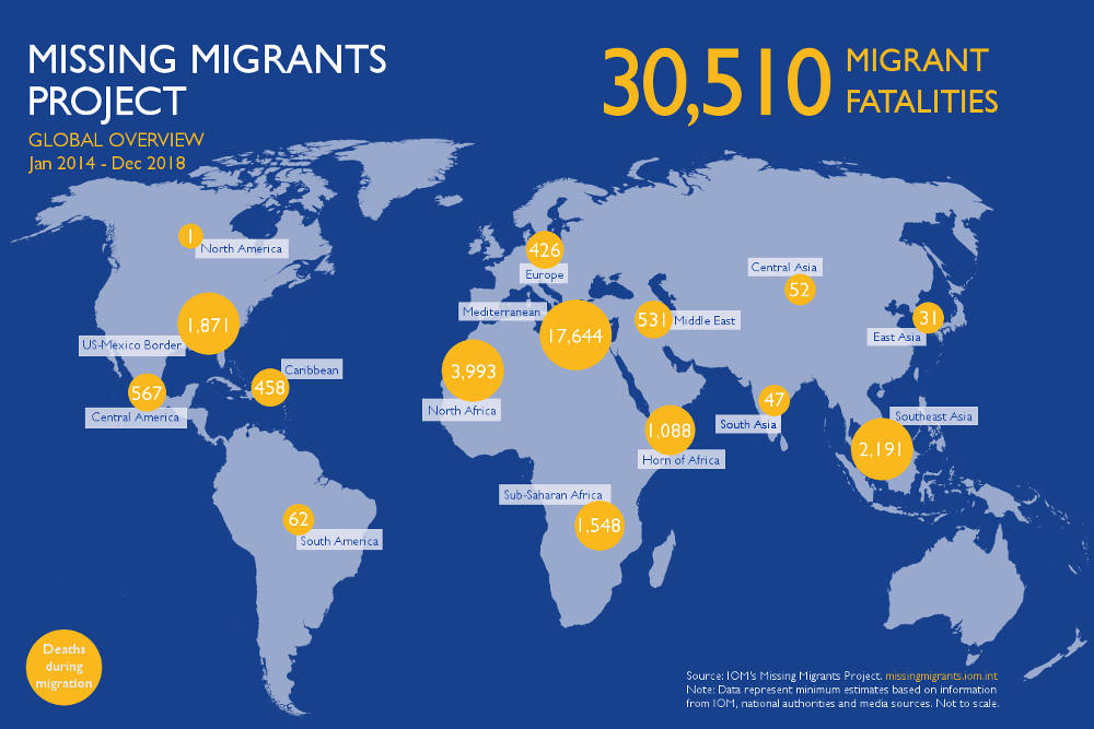 Almeno 30.510 migranti irregolari sono morti per annegamento o per altre motivazioni legate alle difficili condizioni ambientali tra il 2014 e il 2018 secondo un rapporto diffuso dal Missing Migrants Project, un progetto della Organizzazione Internazionale per le Migrazioni (OIM) che si occupa di tenere il conto dei migranti irregolari scomparsi.