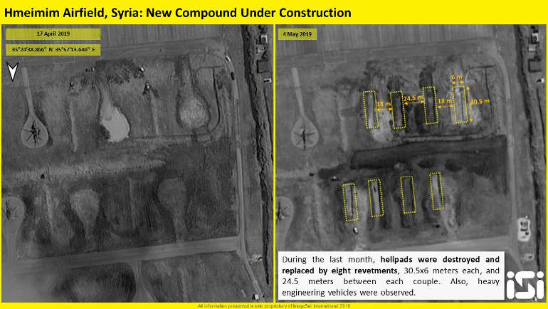 All’inizio di maggio di quest’anno (tra i giorni 4 e 9) le immagini satellitari di ISI (ImageSatIntl) hanno rilevato un’insolita attività sulla base aerea di Hmeimim, con modifiche e movimenti in una zona specifica, dove sorgevano delle piazzole per elicotteri militari.